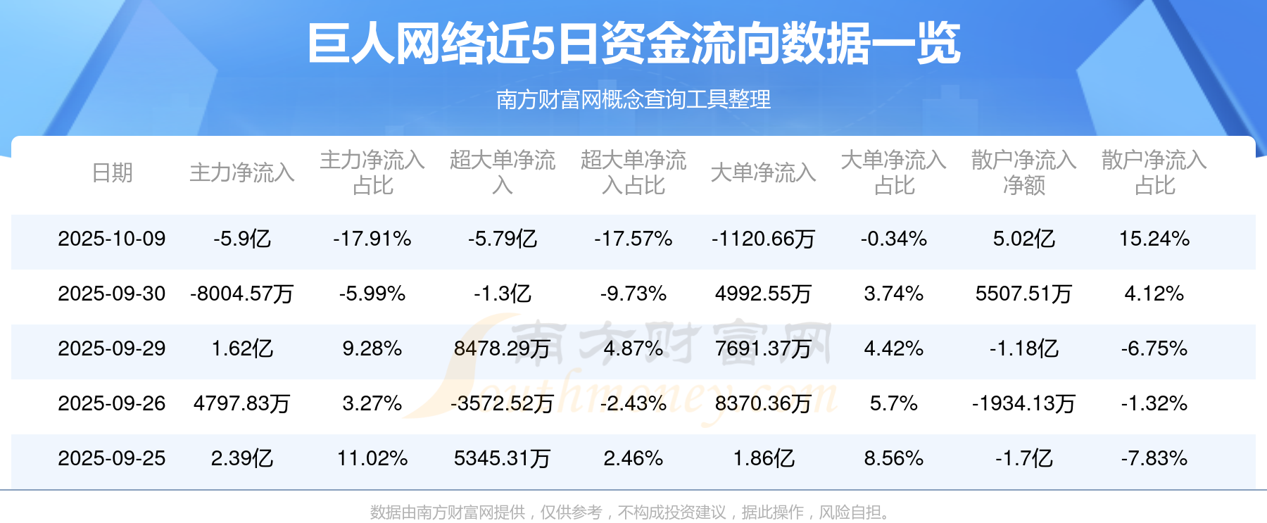 10月9日消息,巨人網(wǎng)絡(luò)主力資金凈流出5.9億元,超大單資金凈流出5.79億元,散戶資金凈流入5.02億元。