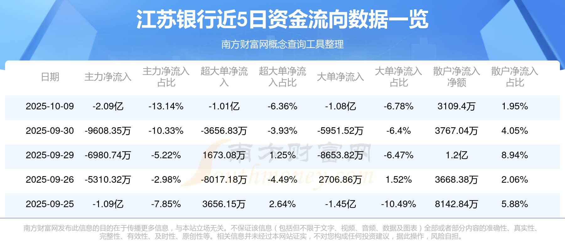 10月9日消息,江蘇銀行資金凈流出2.09億元,超大單資金凈流出1.01億元,換手率0.87%,成交金額15.93億元。