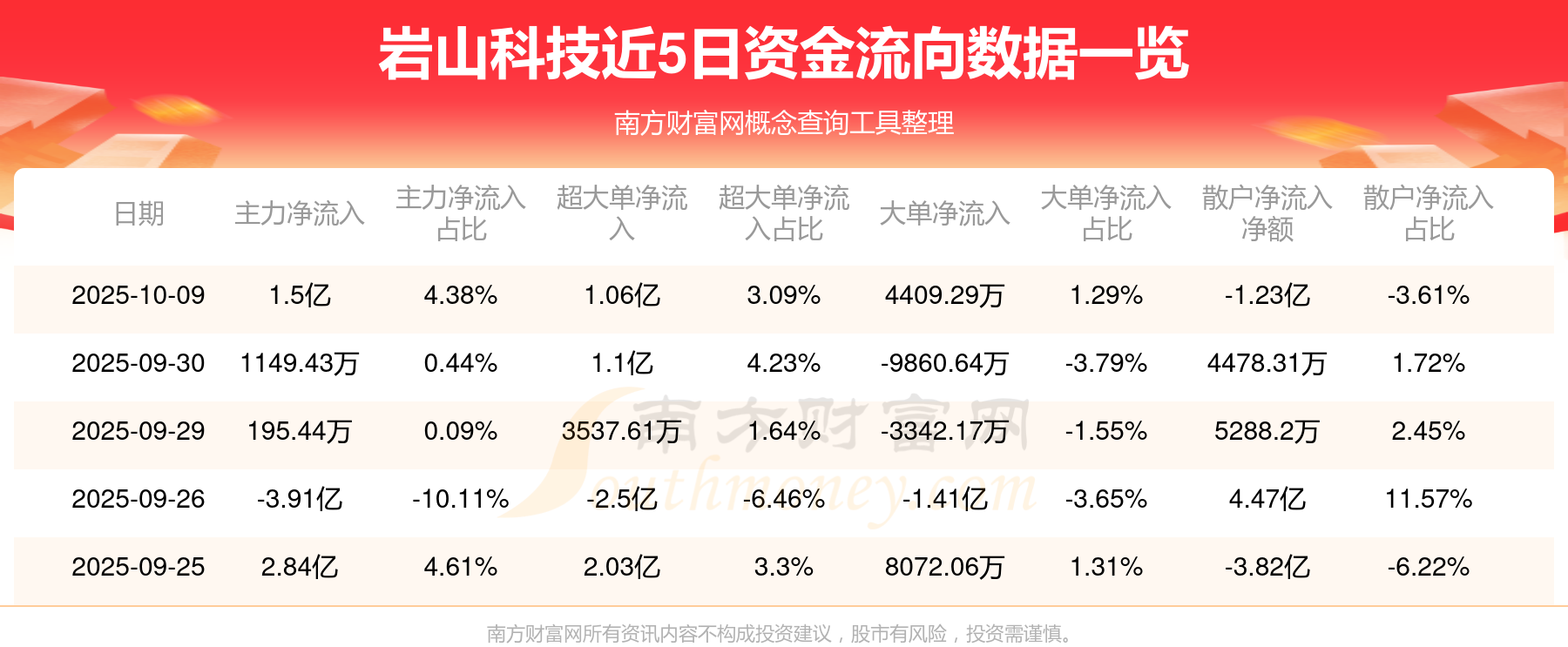 10月9日消息,巖山科技主力凈流入1.5億元,超大單凈流入1.06億元,散戶(hù)凈流出1.23億元。