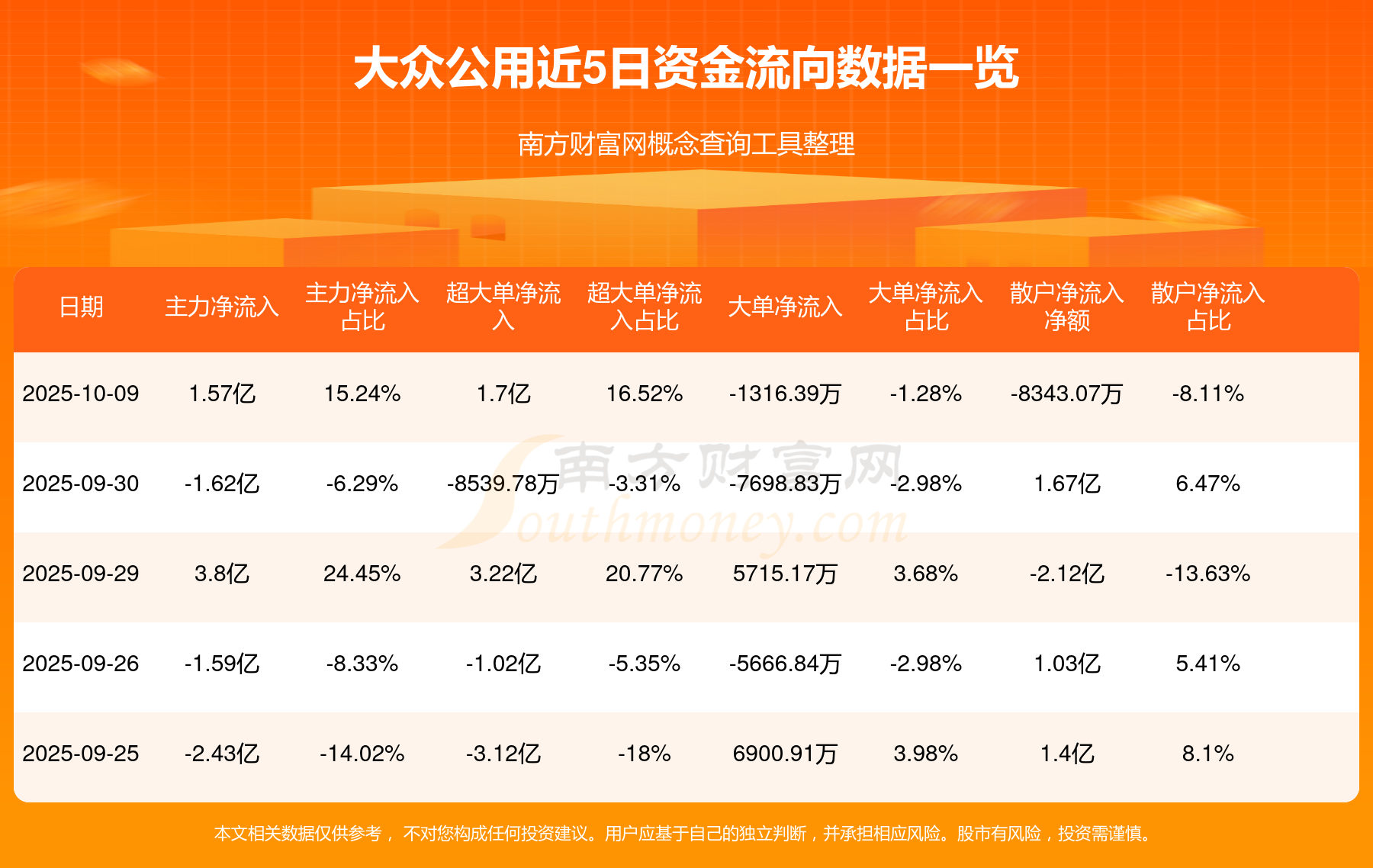 10月9日消息,大眾公用10月9日主力凈流入1.57億元,超大單凈流入1.7億元,大單凈流出1316.39萬元,散戶凈流出8343.07萬元。
