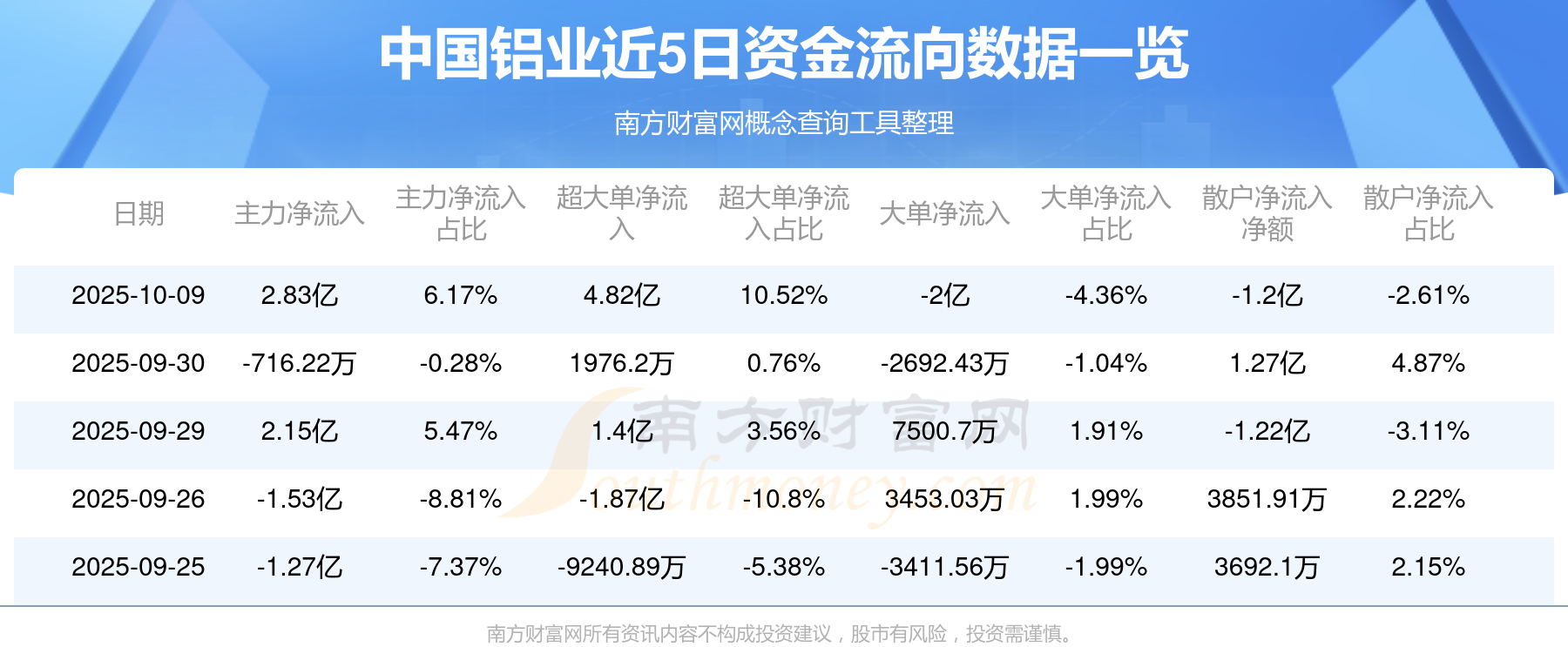 10月9日消息,中國鋁業(yè)10月9日主力資金凈流入2.83億元,超大單資金凈流入4.82億元,大單資金凈流出2億元,散戶資金凈流出1.2億元。