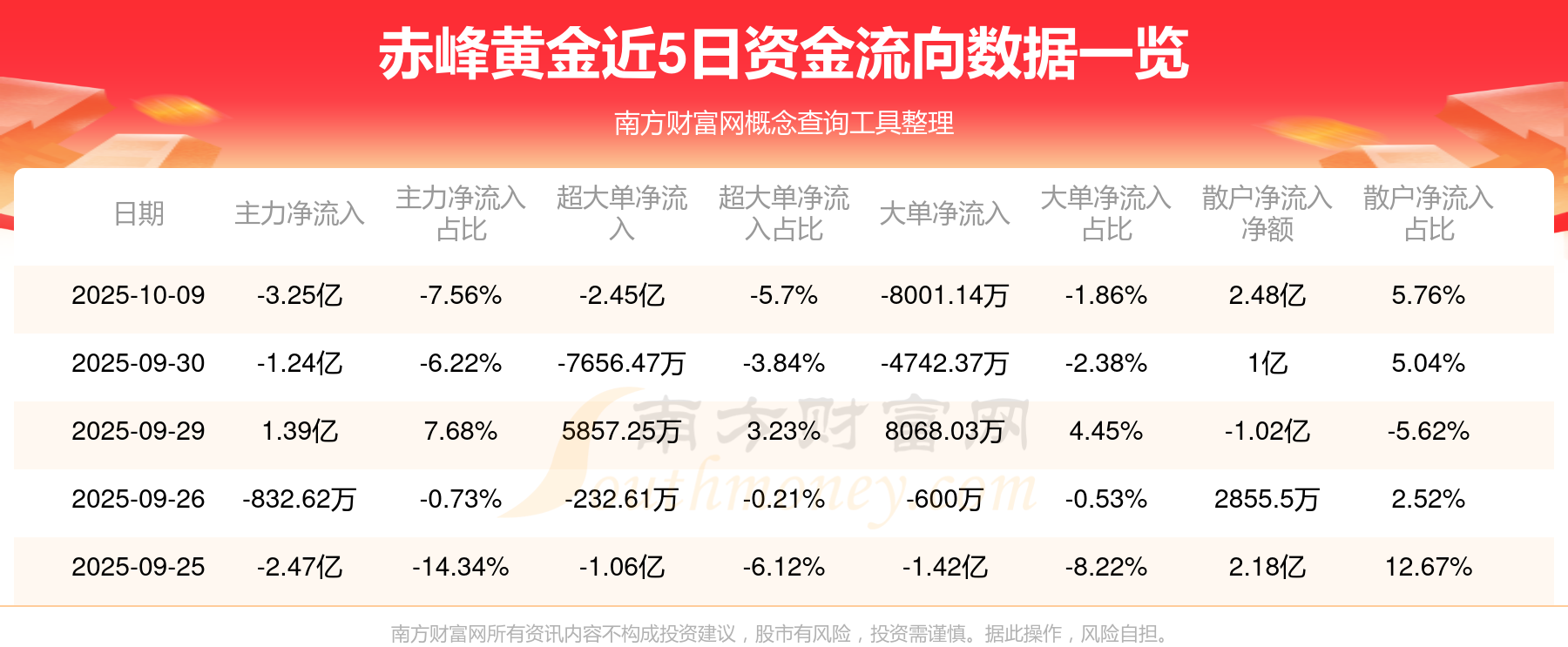 10月9日消息,赤峰黃金10月9日主力資金凈流出3.25億元,超大單資金凈流出2.45億元,大單資金凈流出8001.14萬(wàn)元,散戶(hù)資金凈流入2.48億元。
