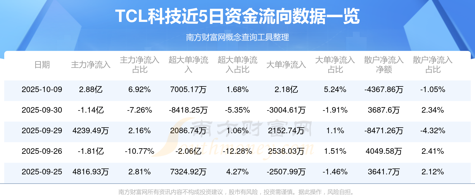 10月9日消息,TCL科技主力凈流入2.88億元,超大單凈流入7005.17萬元,散戶凈流出4367.86萬元。