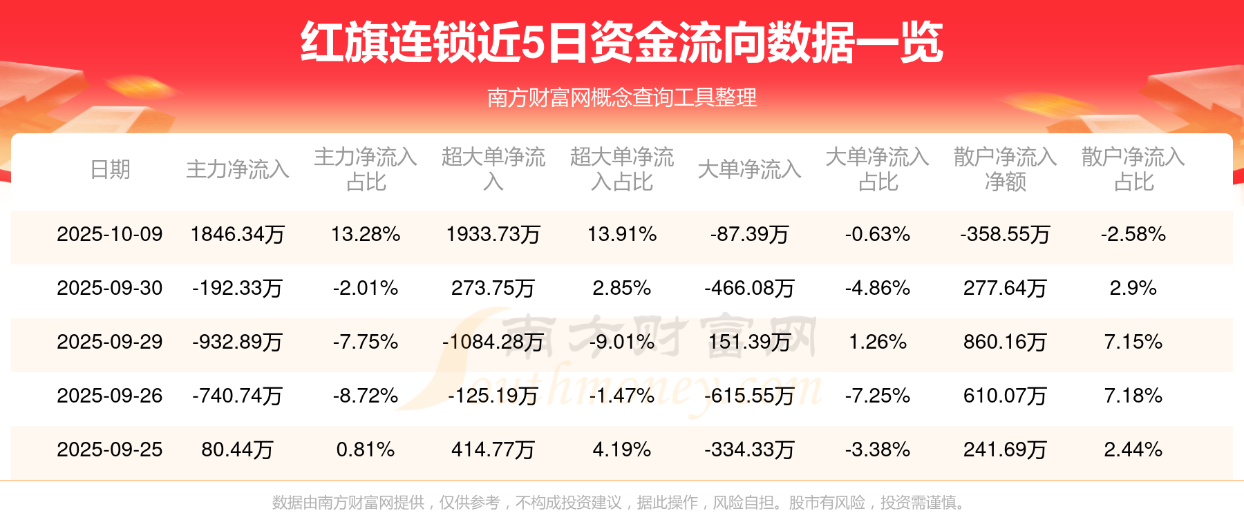 10月9日消息,紅旗連鎖10月9日主力凈流入1846.34萬元,超大單凈流入1933.73萬元,大單凈流出87.39萬元,散戶凈流出358.55萬元。