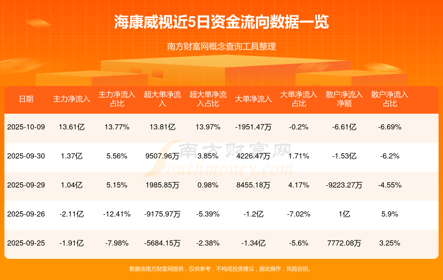 10月9日消息,?低曋髁袅魅13.61億元,超大單凈流入13.81億元,散戶凈流出6.61億元。
