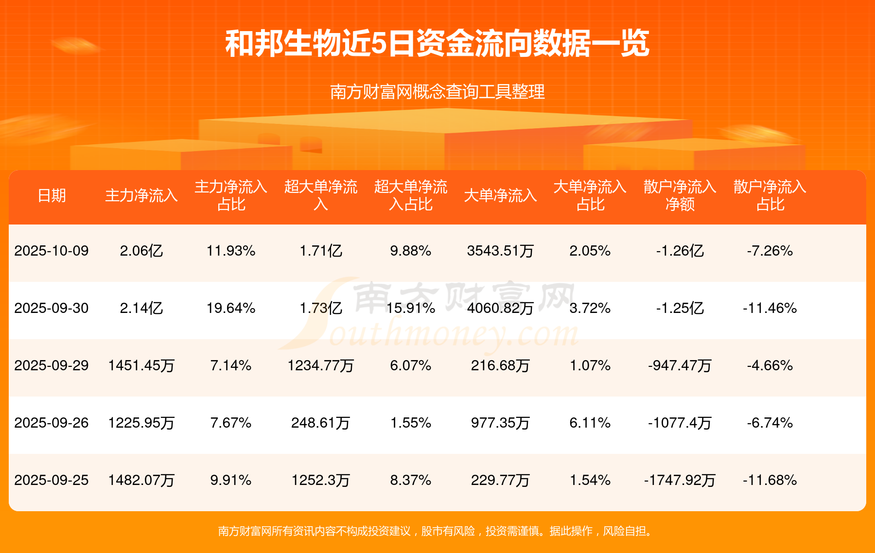10月9日消息,和邦生物10月9日主力資金凈流入2.06億元,超大單資金凈流入1.71億元,大單資金凈流入3543.51萬元,散戶資金凈流出1.26億元。