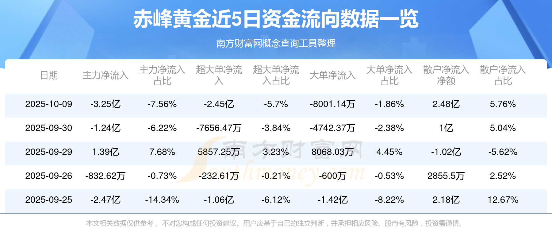 10月9日消息,赤峰黃金10月9日主力資金凈流出3.25億元,超大單資金凈流出2.45億元,大單資金凈流出8001.14萬元,散戶資金凈流入2.48億元。