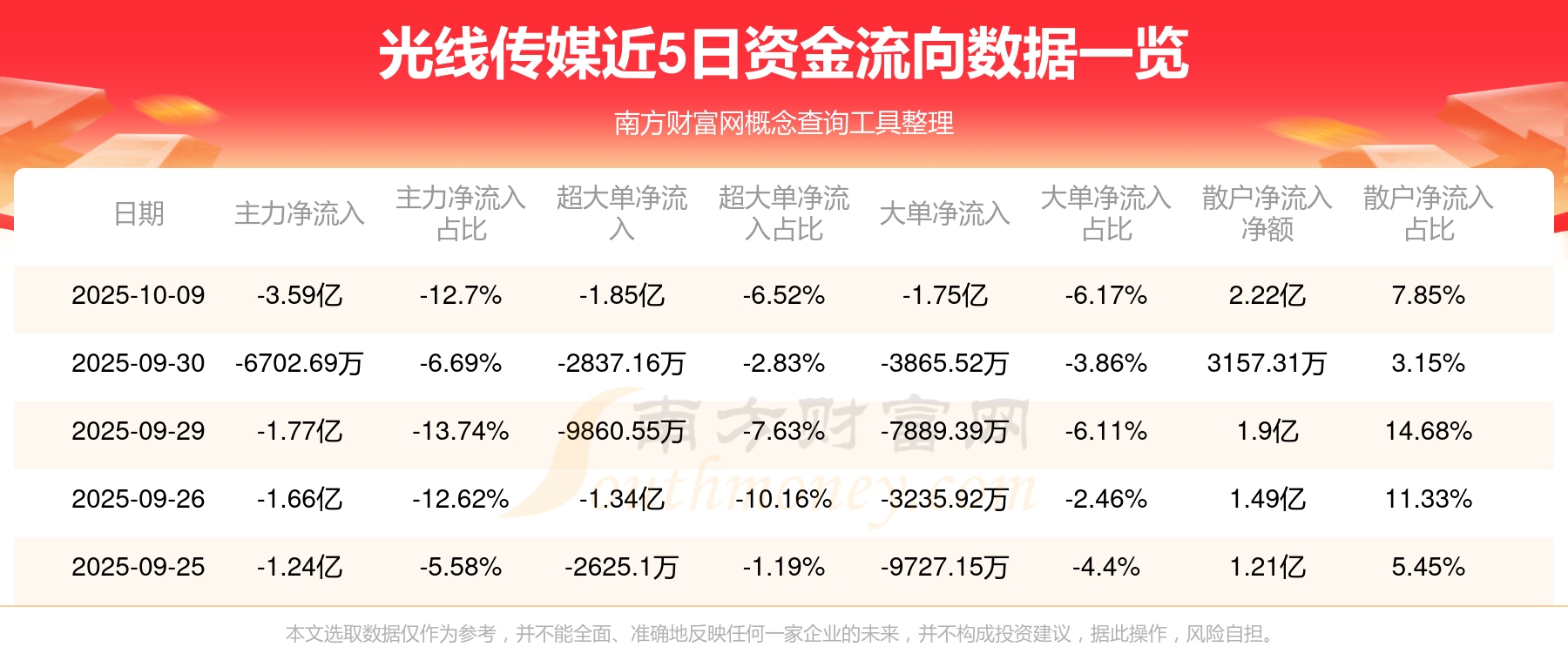 10月9日消息,光線傳媒主力資金凈流出3.59億元,超大單資金凈流出1.85億元,散戶資金凈流入2.22億元。