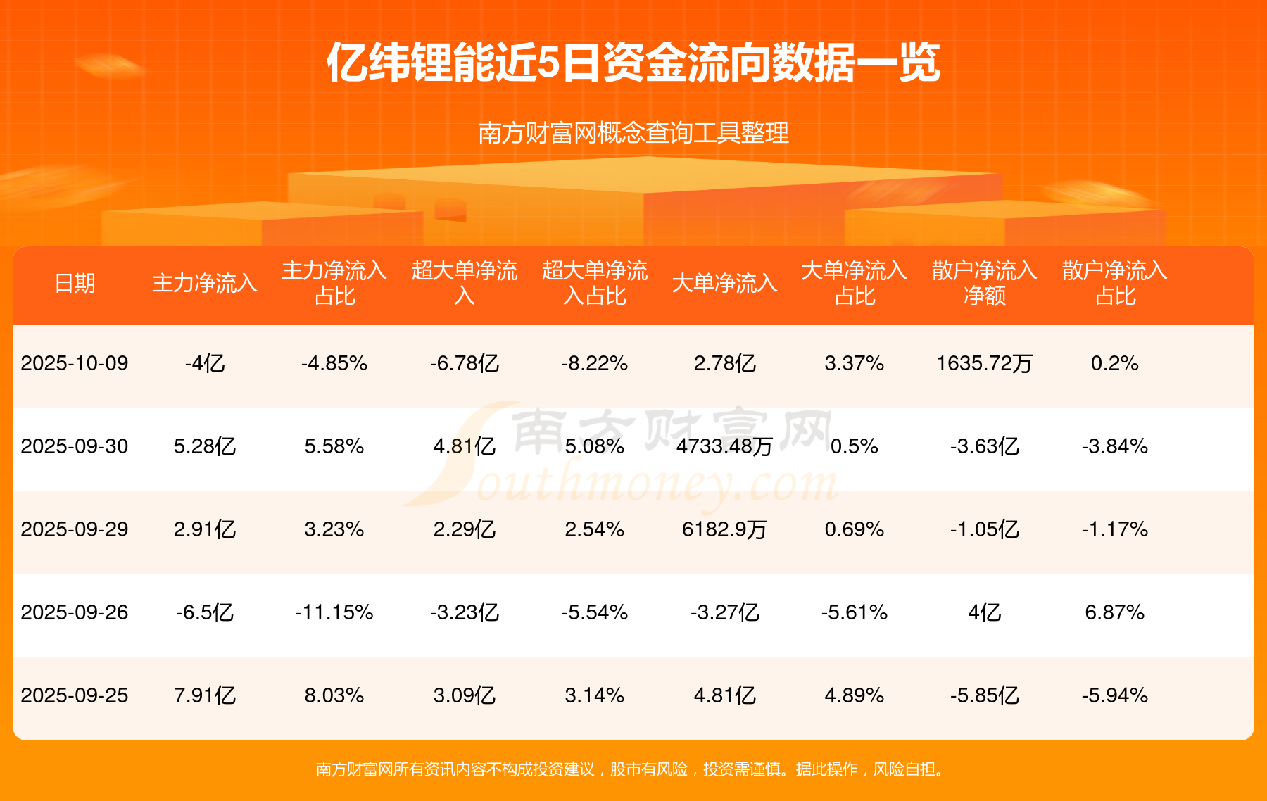 10月9日消息,億緯鋰能10月9日主力資金凈流出4億元,超大單資金凈流出6.78億元,大單資金凈流入2.78億元,散戶資金凈流入1635.72萬元。