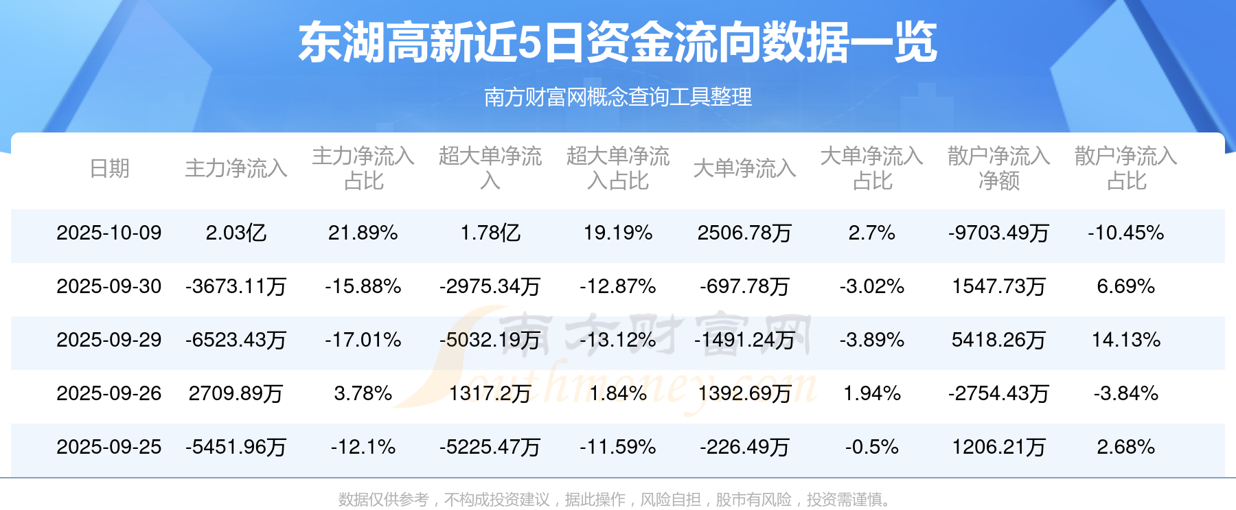 10月9日消息,東湖高新10月9日主力資金凈流入2.03億元,超大單資金凈流入1.78億元,大單資金凈流入2506.78萬元,散戶資金凈流出9703.49萬元。