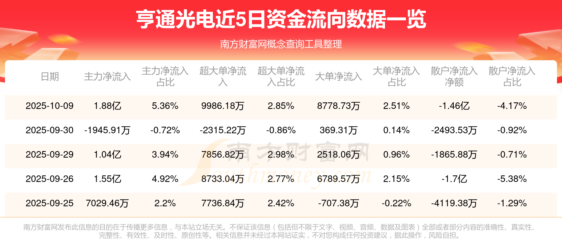 10月9日消息,亨通光電主力凈流入1.88億元,超大單凈流入9986.18萬元,散戶凈流出1.46億元。