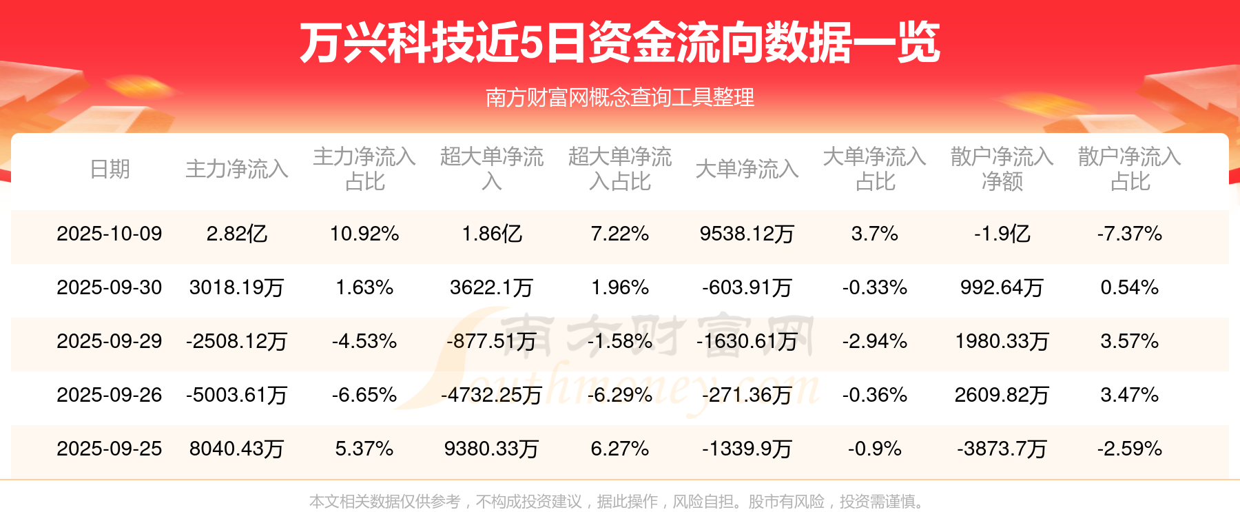 10月9日消息,萬(wàn)興科技10月9日主力資金凈流入2.82億元,超大單資金凈流入1.86億元,大單資金凈流入9538.12萬(wàn)元,散戶資金凈流出1.9億元。