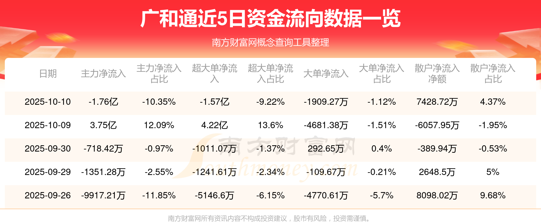 10月10日消息,廣和通資金凈流出1.76億元,超大單凈流出1.57億元,換手率9.87%,成交金額16.99億元。