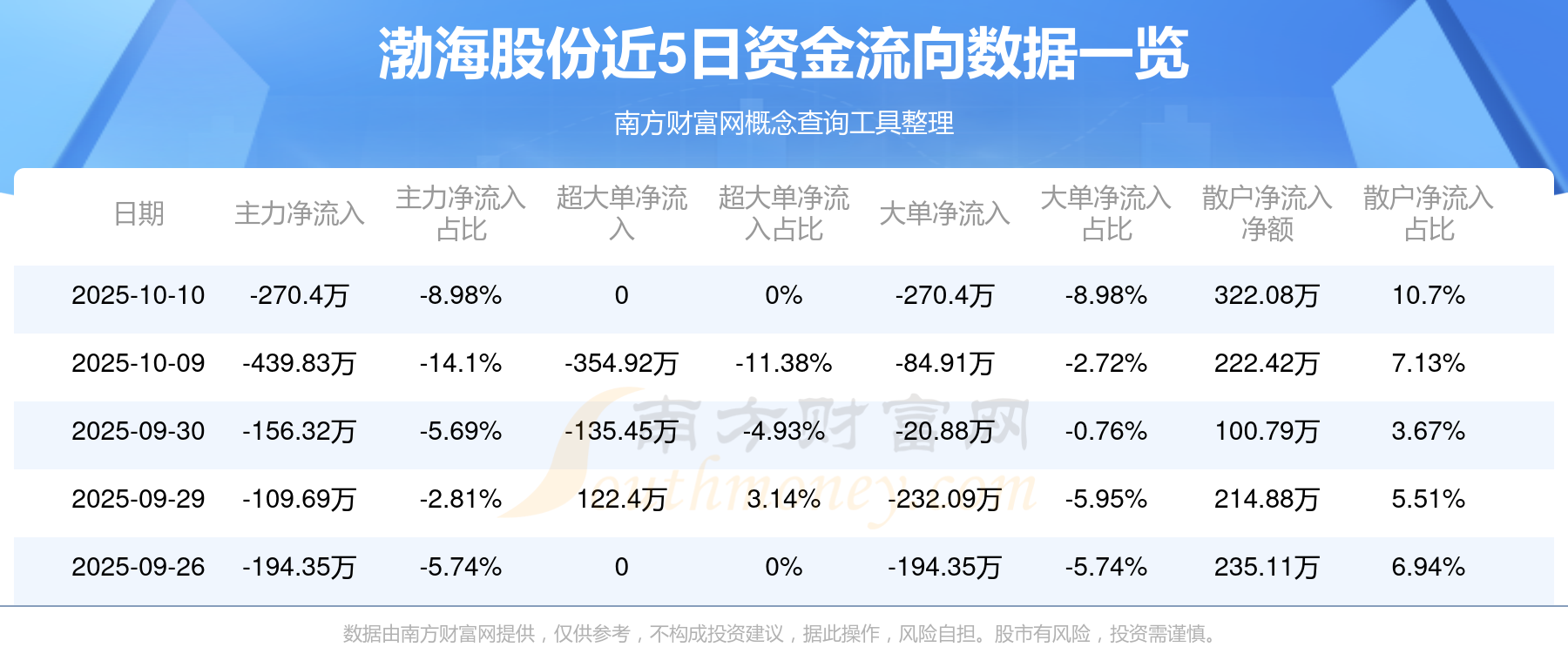 10月10日消息,渤海股份資金凈流出270.4萬元,換手率1.24%,成交金額3010.96萬元。