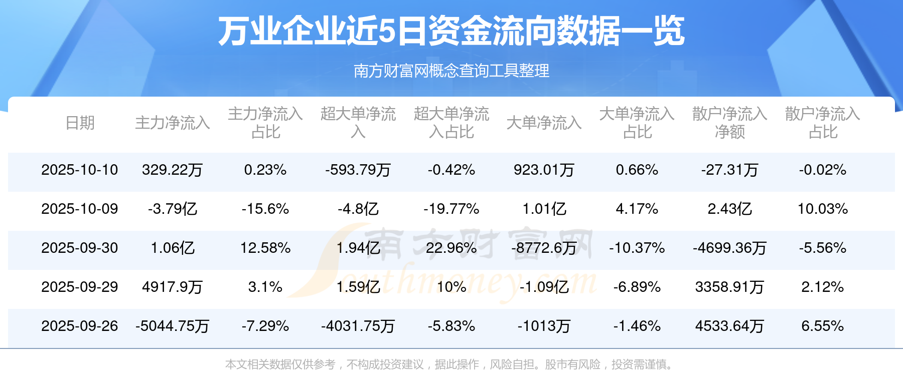 10月10日消息,萬(wàn)業(yè)企業(yè)10月10日主力凈流入329.22萬(wàn)元,超大單凈流出593.79萬(wàn)元,大單凈流入923.01萬(wàn)元,散戶凈流出27.31萬(wàn)元。