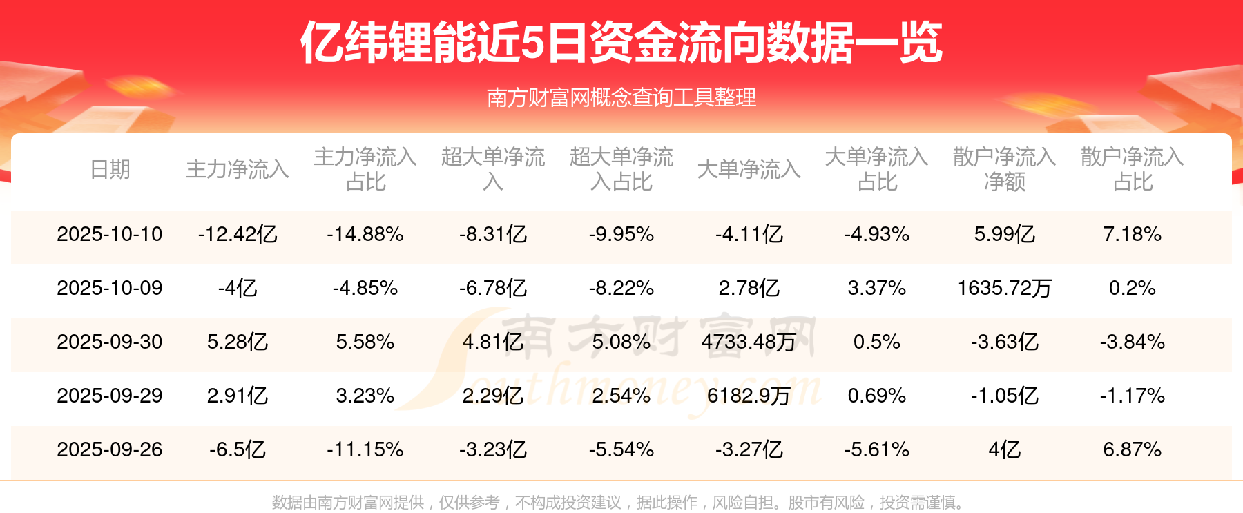 10月10日消息,億緯鋰能10月10日主力資金凈流出12.42億元,超大單資金凈流出8.31億元,大單資金凈流出4.11億元,散戶資金凈流入5.99億元。