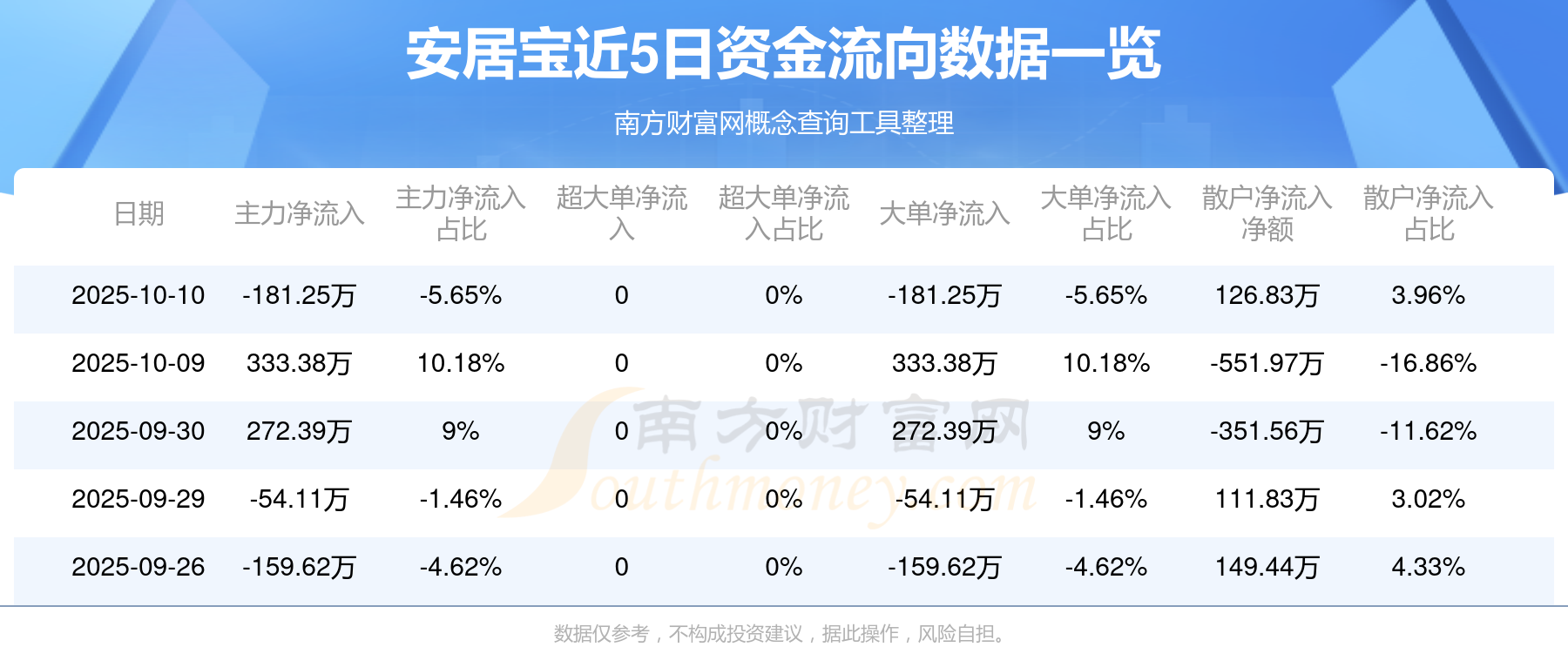 10月10日消息,安居寶10月10日主力資金凈流出181.25萬元,大單資金凈流出181.25萬元,散戶資金凈流入126.83萬元。