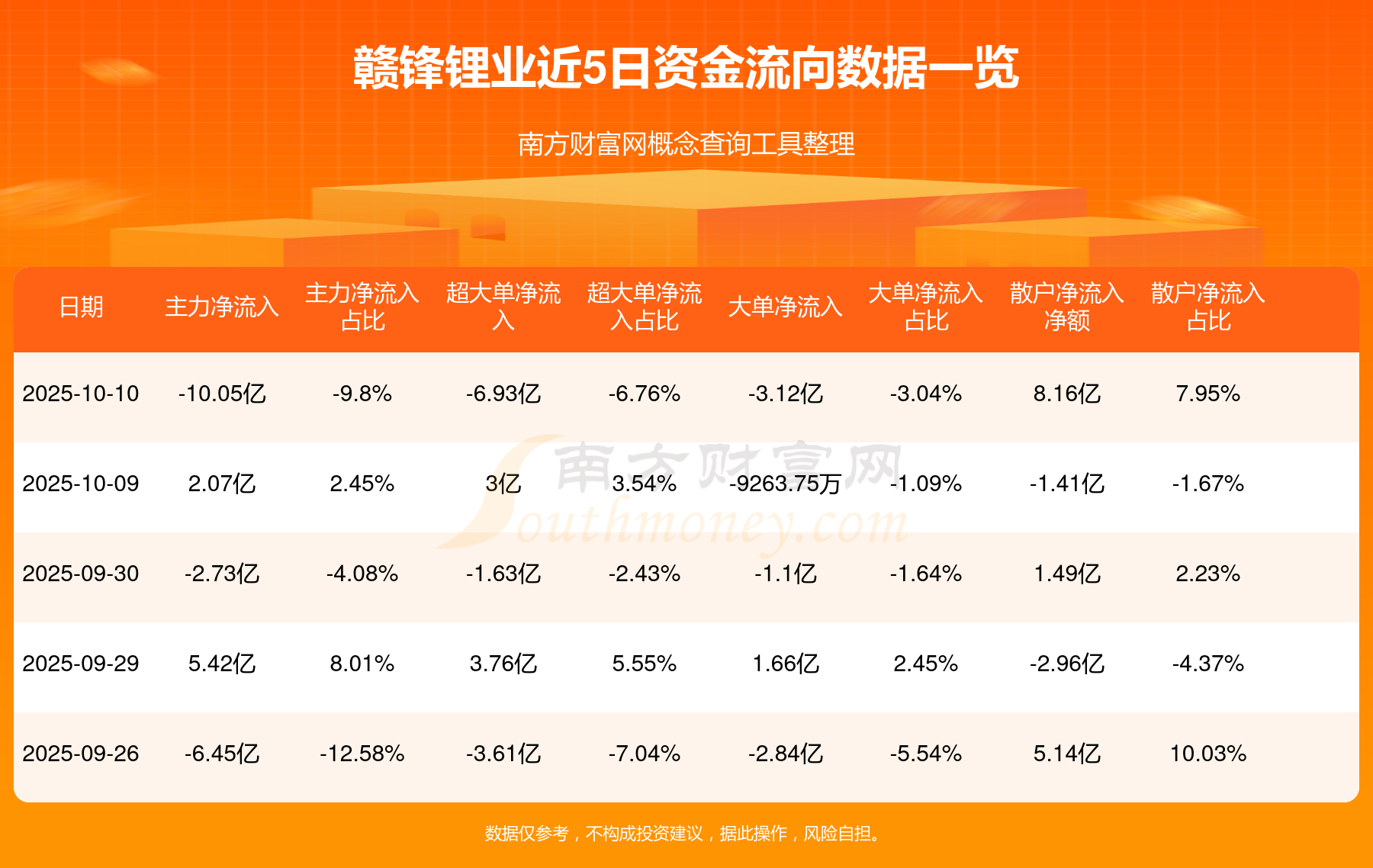 10月10日消息,贛鋒鋰業(yè)資金凈流出-10.05億元,超大單資金凈流入-6.93億元,最新報63.930元,換手率12.93%,成交總金額102.6億元。