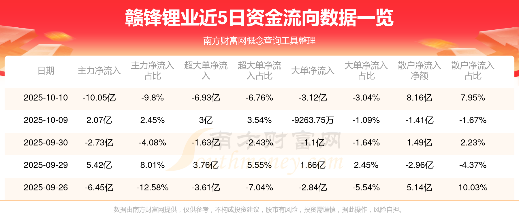 10月10日消息,贛鋒鋰業(yè)主力資金凈流出10.05億元,超大單資金凈流出6.93億元,散戶資金凈流入8.16億元。