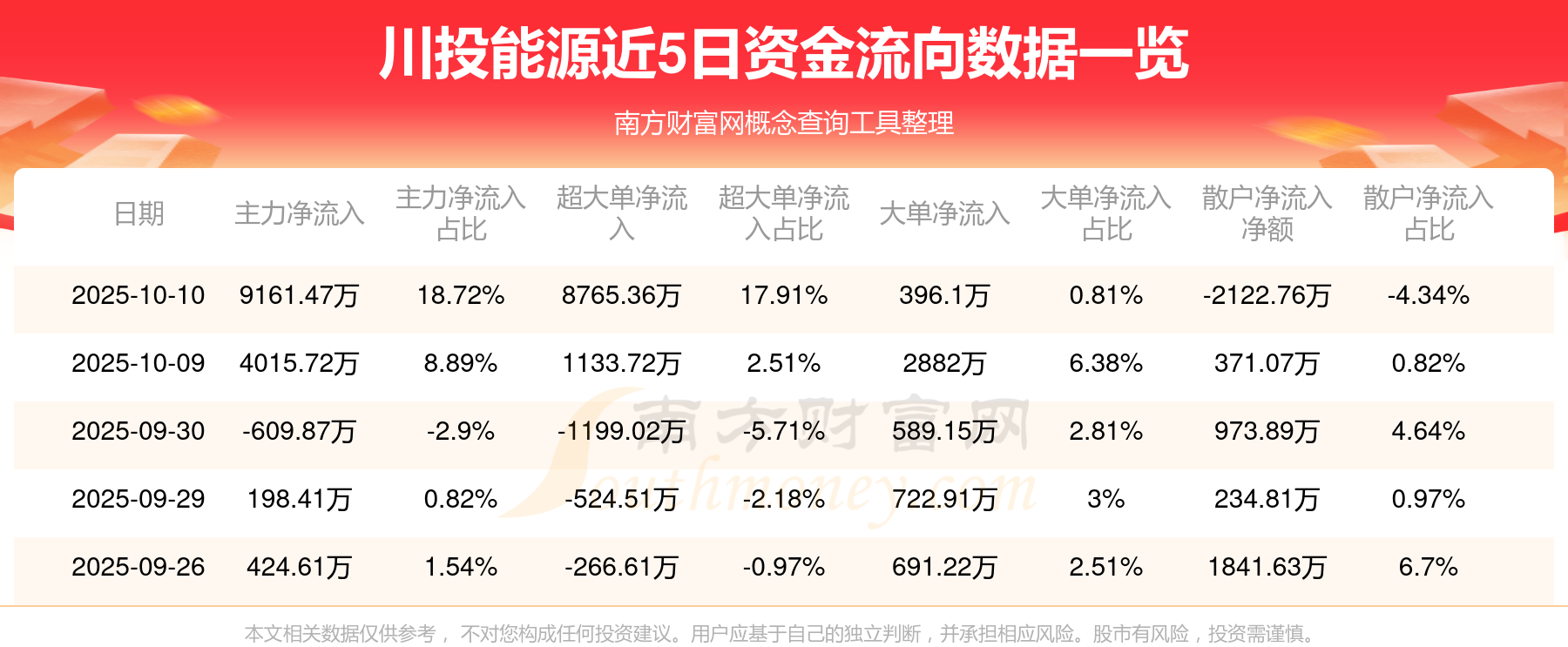 10月10日消息,川投能源資金凈流入9161.47萬(wàn)元,超大單資金凈流入8765.36萬(wàn)元,換手率0.69%,成交金額4.9億元。