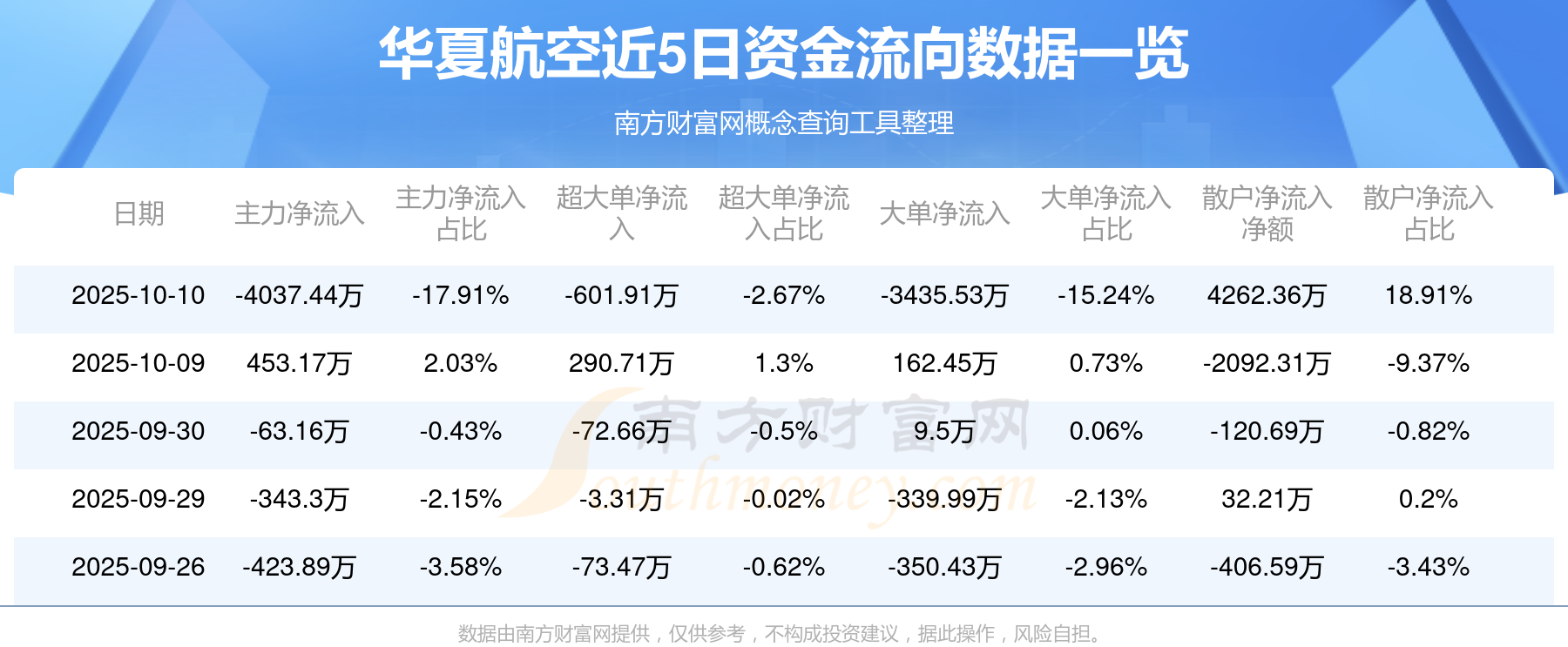 10月10日消息,華夏航空主力資金凈流出4037.44萬(wàn)元,超大單資金凈流出601.91萬(wàn)元,散戶資金凈流入4262.36萬(wàn)元。