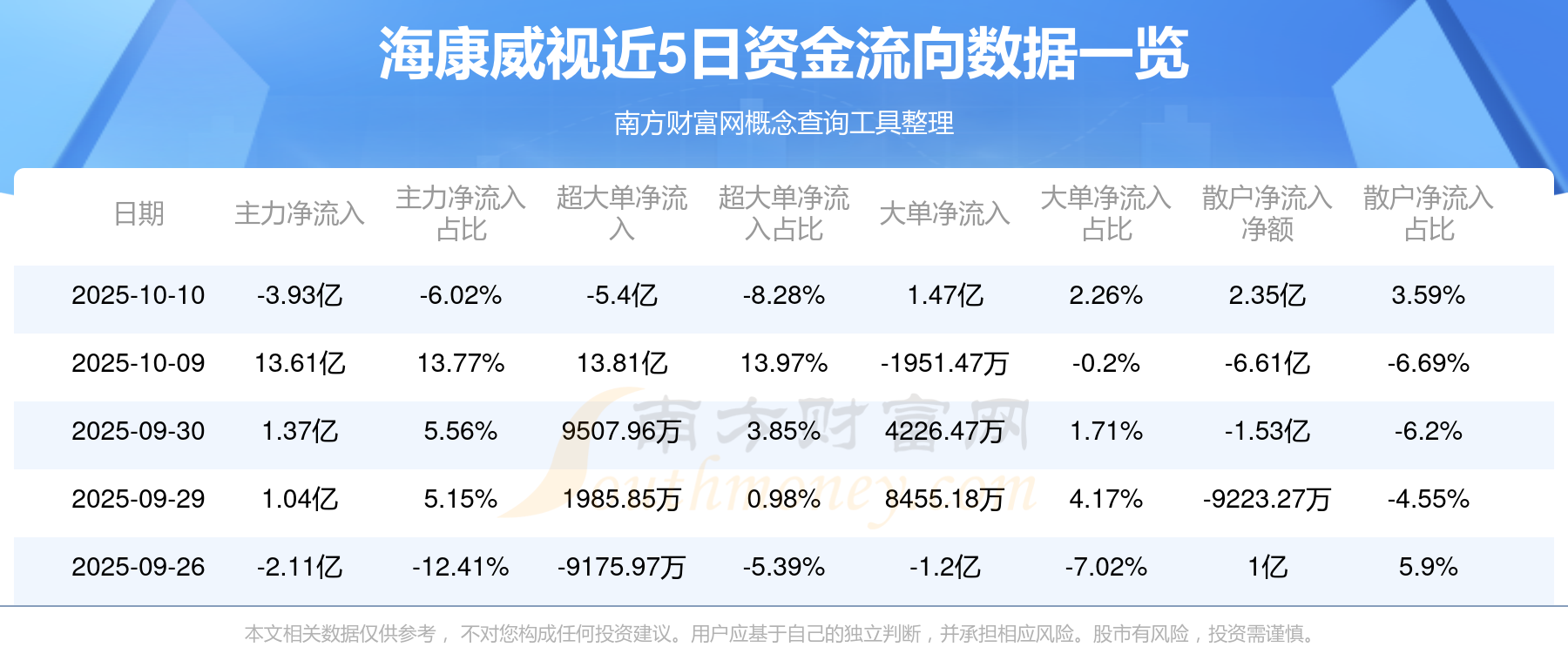 10月10日消息,海康威視主力資金凈流出3.93億元,超大單資金凈流出5.4億元,散戶資金凈流入2.35億元。