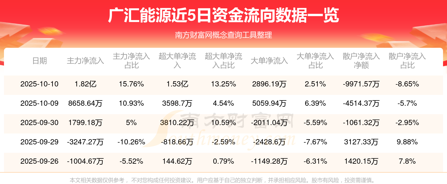 10月10日消息,廣匯能源10月10日主力凈流入1.82億元,超大單凈流入1.53億元,大單凈流入2896.19萬元,散戶凈流出9971.57萬元。