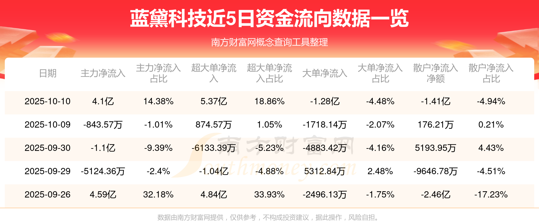10月10日該股主力凈流入4.1億元,超大單凈流入5.37億元,大單凈流出1.28億元,中單凈流出2.69億元,散戶凈流出1.41億元。
