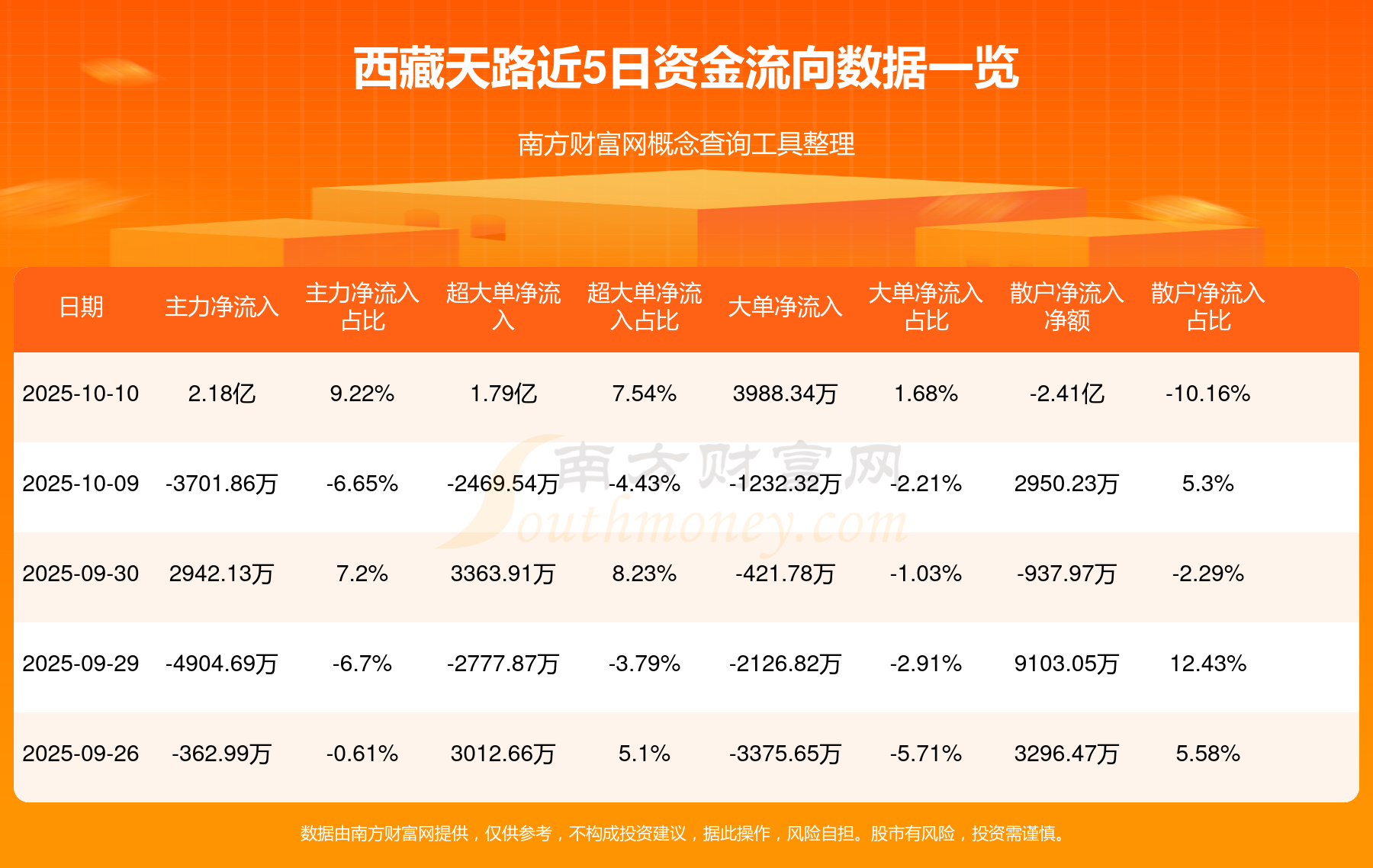 10月10日消息,西藏天路10月10日主力凈流入2.18億元,超大單凈流入1.79億元,大單凈流入3988.34萬元,散戶凈流出2.41億元。