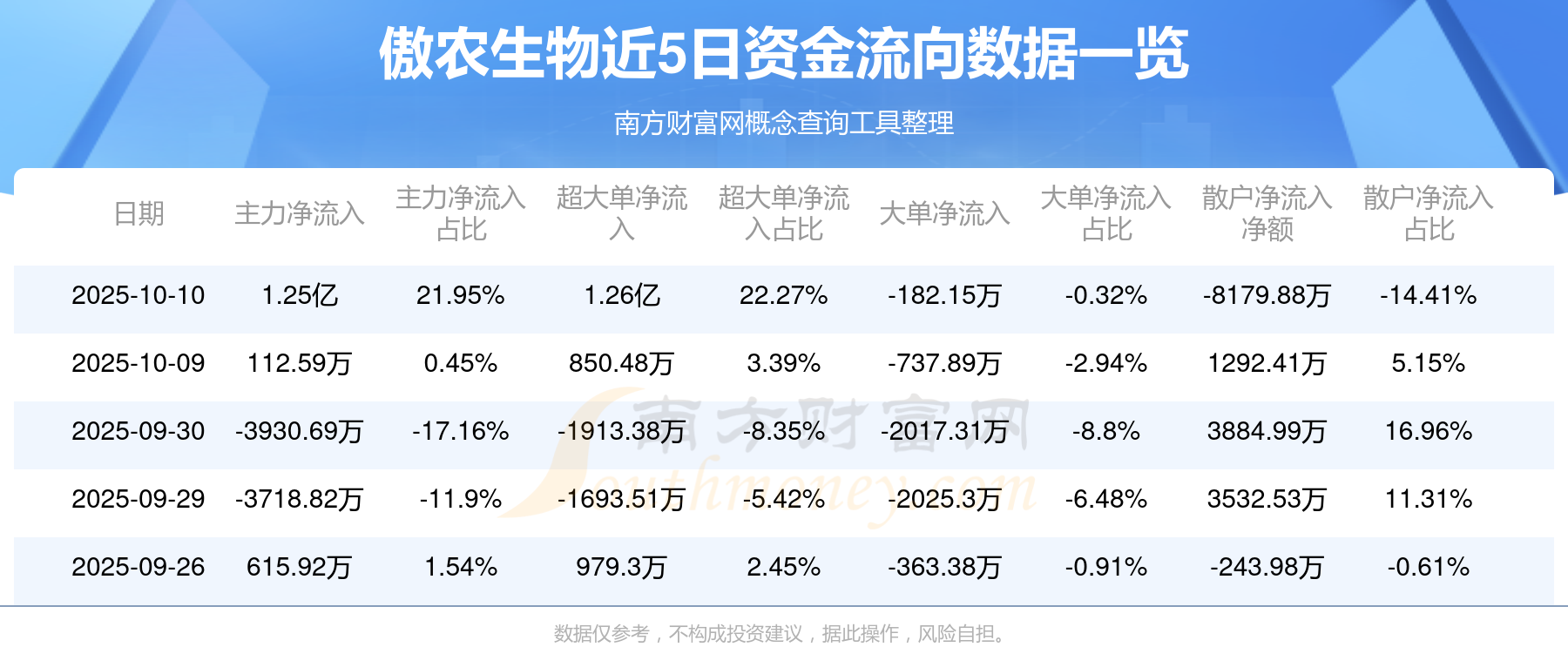 10月10日消息,傲農(nóng)生物主力凈流入1.25億元,超大單凈流入1.26億元,散戶凈流出8179.88萬元。