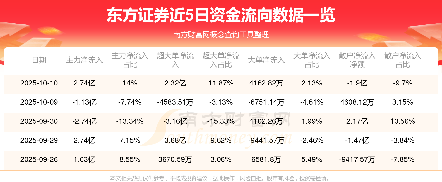 10月10日消息,東方證券主力凈流入2.74億元,超大單凈流入2.32億元,散戶凈流出1.9億元。