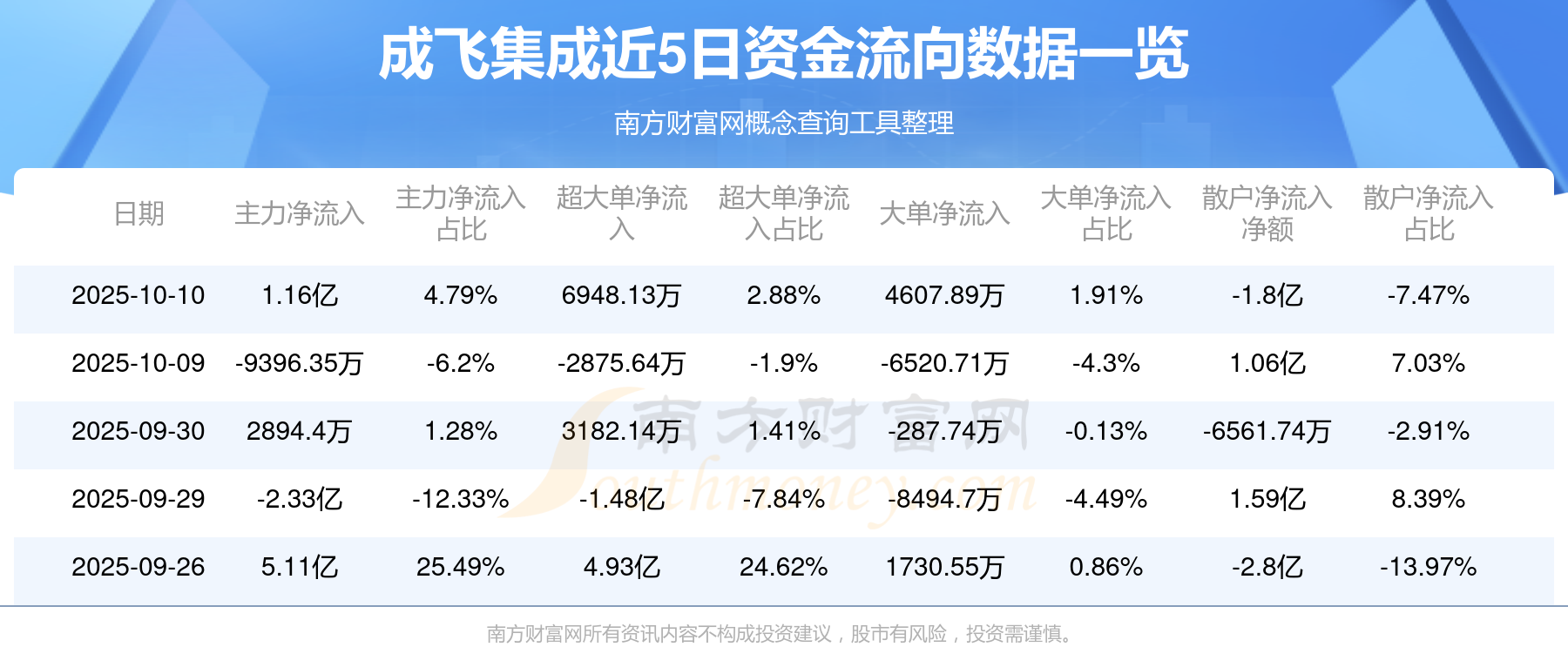10月10日消息,成飛集成主力資金凈流入1.16億元,超大單資金凈流入6948.13萬元,散戶資金凈流出1.8億元。