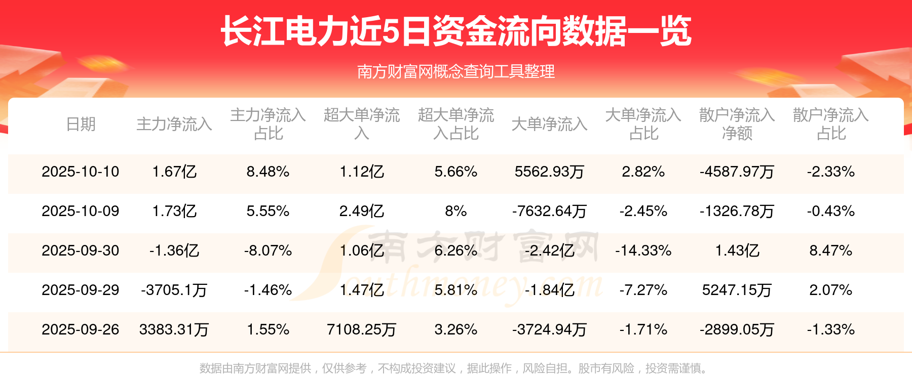 10月10日消息,長(zhǎng)江電力主力凈流入1.67億元,超大單凈流入1.12億元,散戶凈流出4587.97萬元。