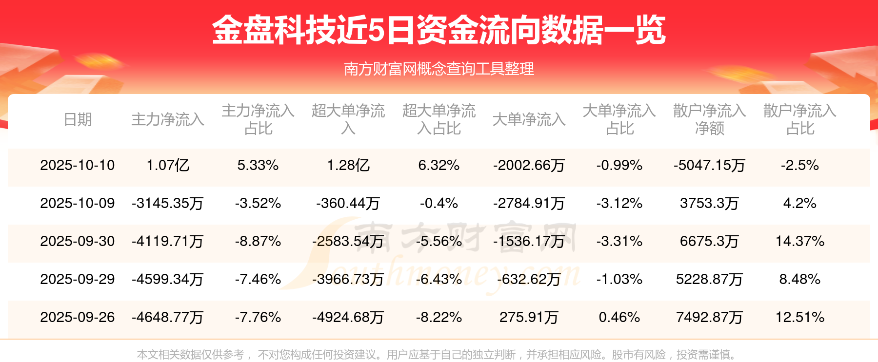 10月10日消息,金盤(pán)科技資金凈流入1.07億元,超大單凈流入1.28億元,換手率7.39%,成交金額20.19億元。