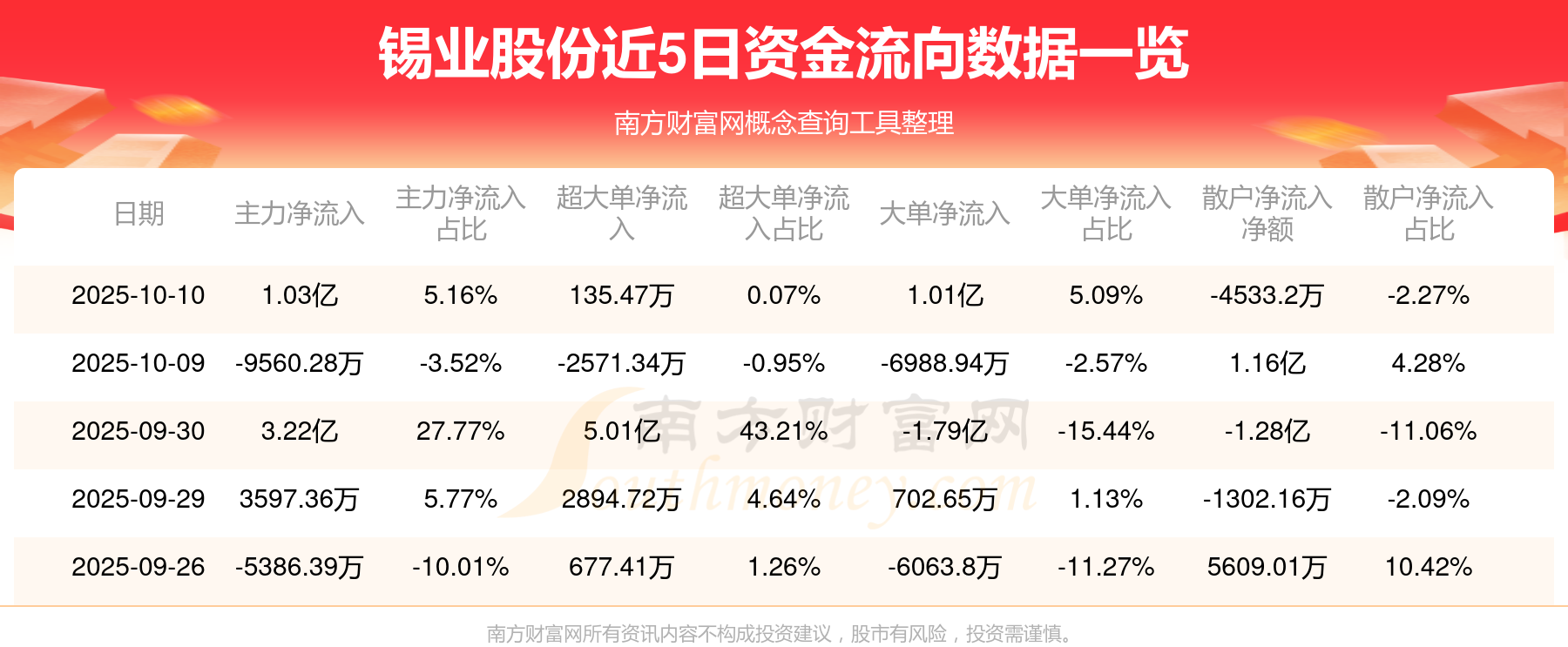 10月10日消息,錫業(yè)股份主力凈流入1.03億元,超大單凈流入135.47萬元,散戶凈流出4533.2萬元。