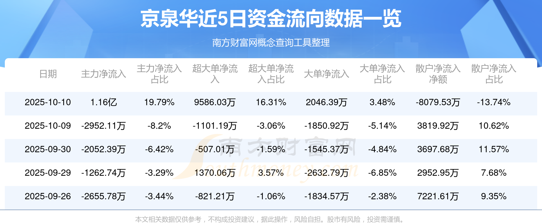 10月10日消息,京泉華資金凈流入1.16億元,超大單凈流入9586.03萬(wàn)元,換手率12.92%,成交金額5.88億元。