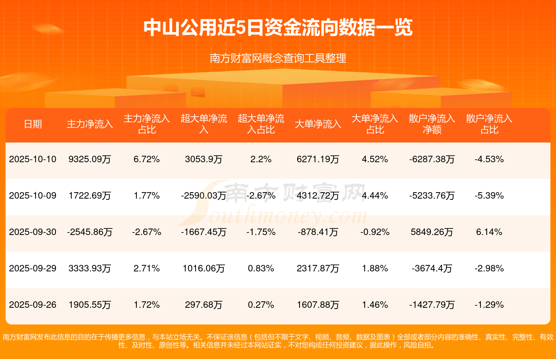 10月10日消息,中山公用10月10日主力資金凈流入9325.09萬元,超大單資金凈流入3053.9萬元,大單資金凈流入6271.19萬元,散戶資金凈流出6287.38萬元。