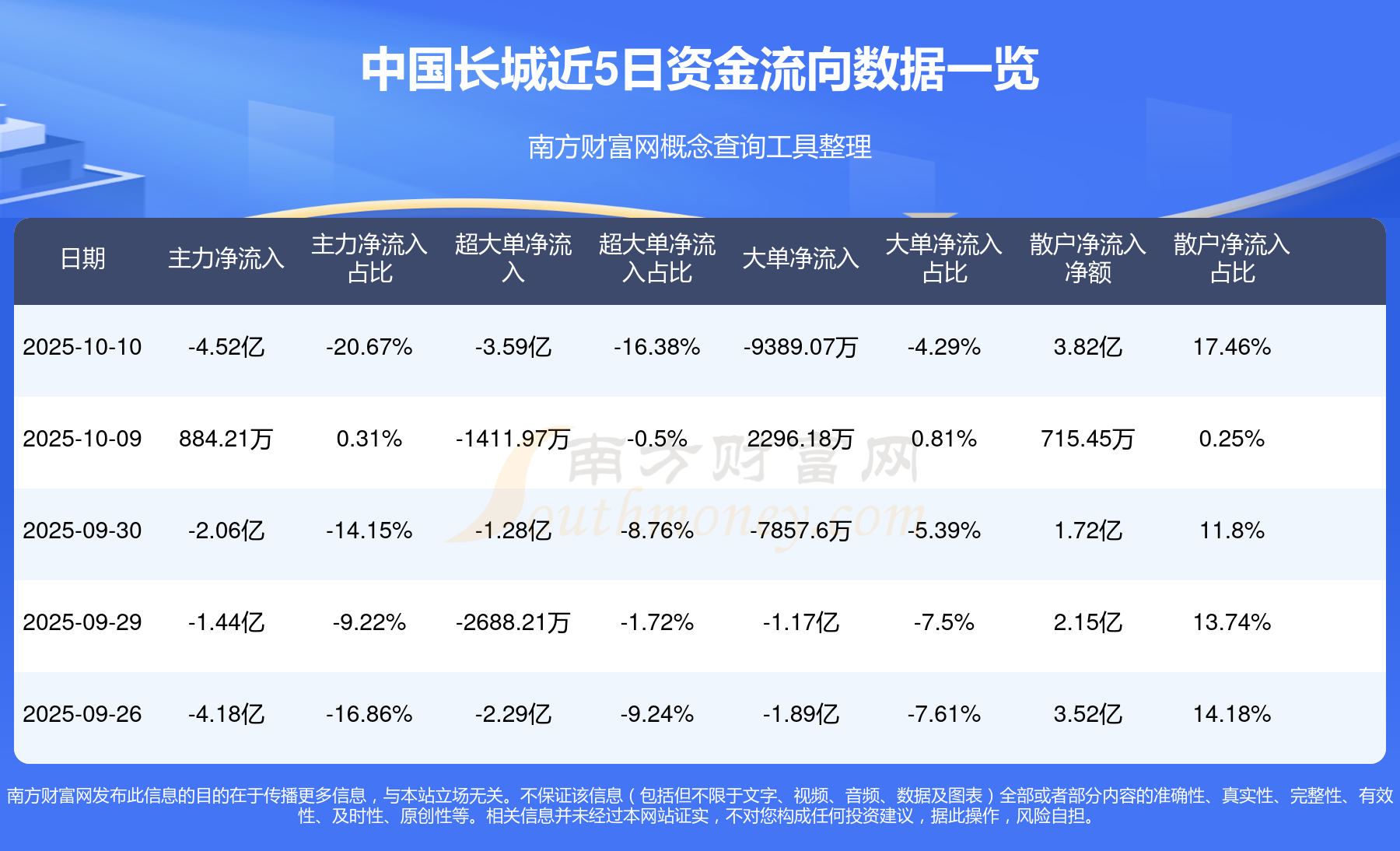 10月10日消息,中國長城主力凈流出4.52億元,超大單凈流出3.59億元,散戶凈流入3.82億元。