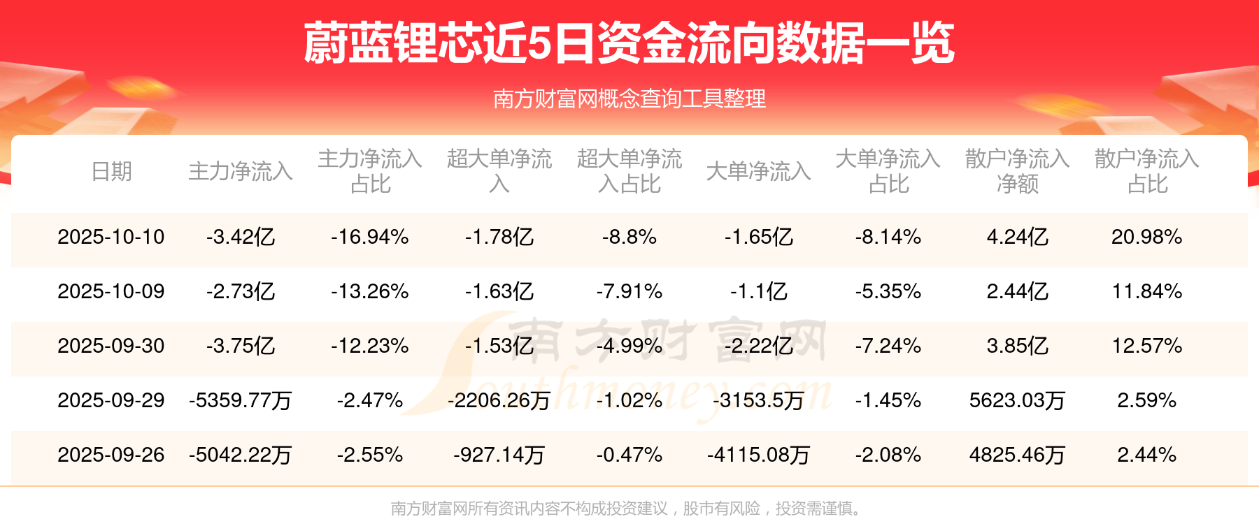 10月10日該股主力資金凈流出3.42億元,超大單資金凈流出1.78億元,大單資金凈流出1.65億元,中單資金凈流出8170.36萬(wàn)元,散戶資金凈流入4.24億元。