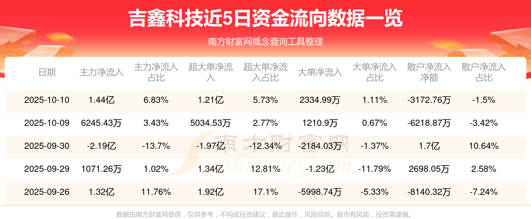 10月10日消息,吉鑫科技資金凈流入1.44億元,超大單資金凈流入1.21億元,換手率34.47%,成交金額21.09億元。