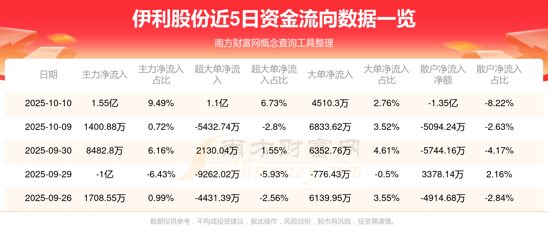 10月10日消息,伊利股份10月10日主力凈流入1.55億元,超大單凈流入1.1億元,大單凈流入4510.3萬元,散戶凈流出1.35億元。