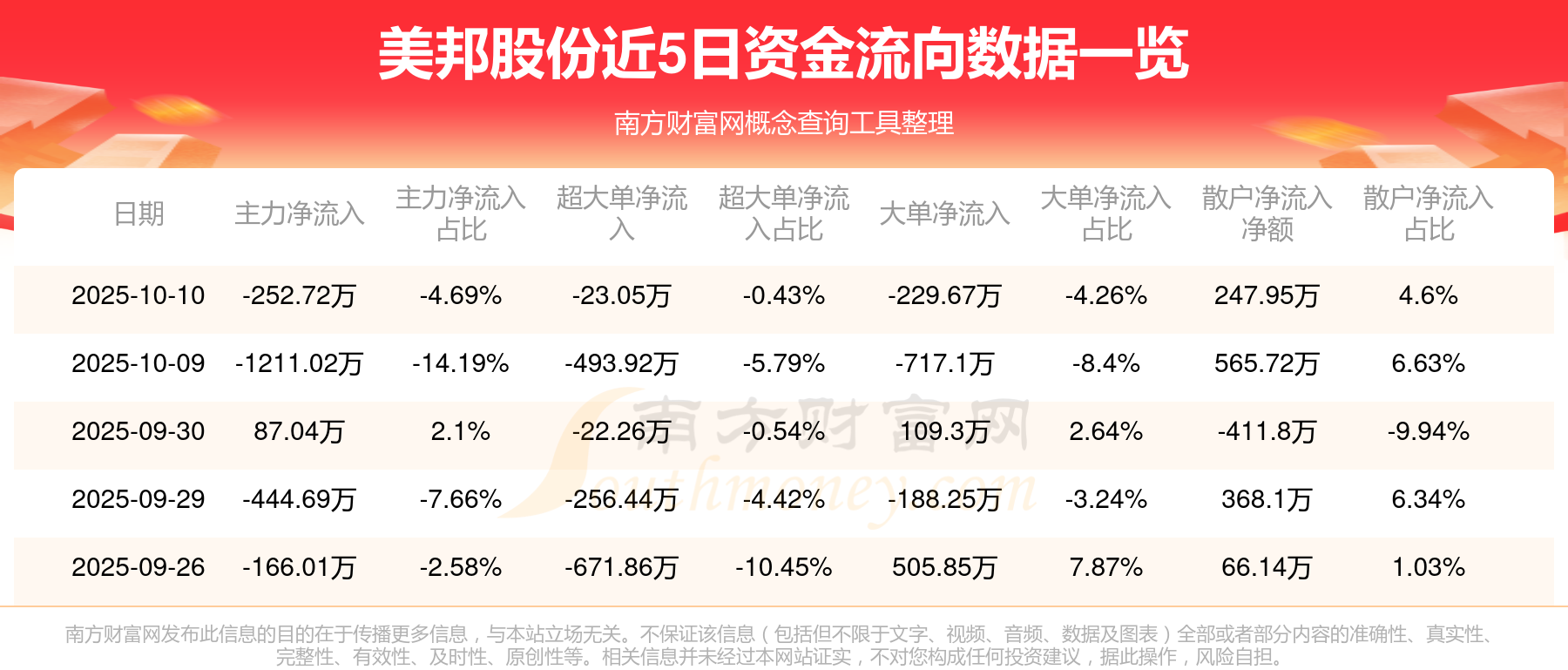 10月10日消息,美邦股份主力資金凈流出252.72萬元,超大單資金凈流出23.05萬元,散戶資金凈流入247.95萬元。