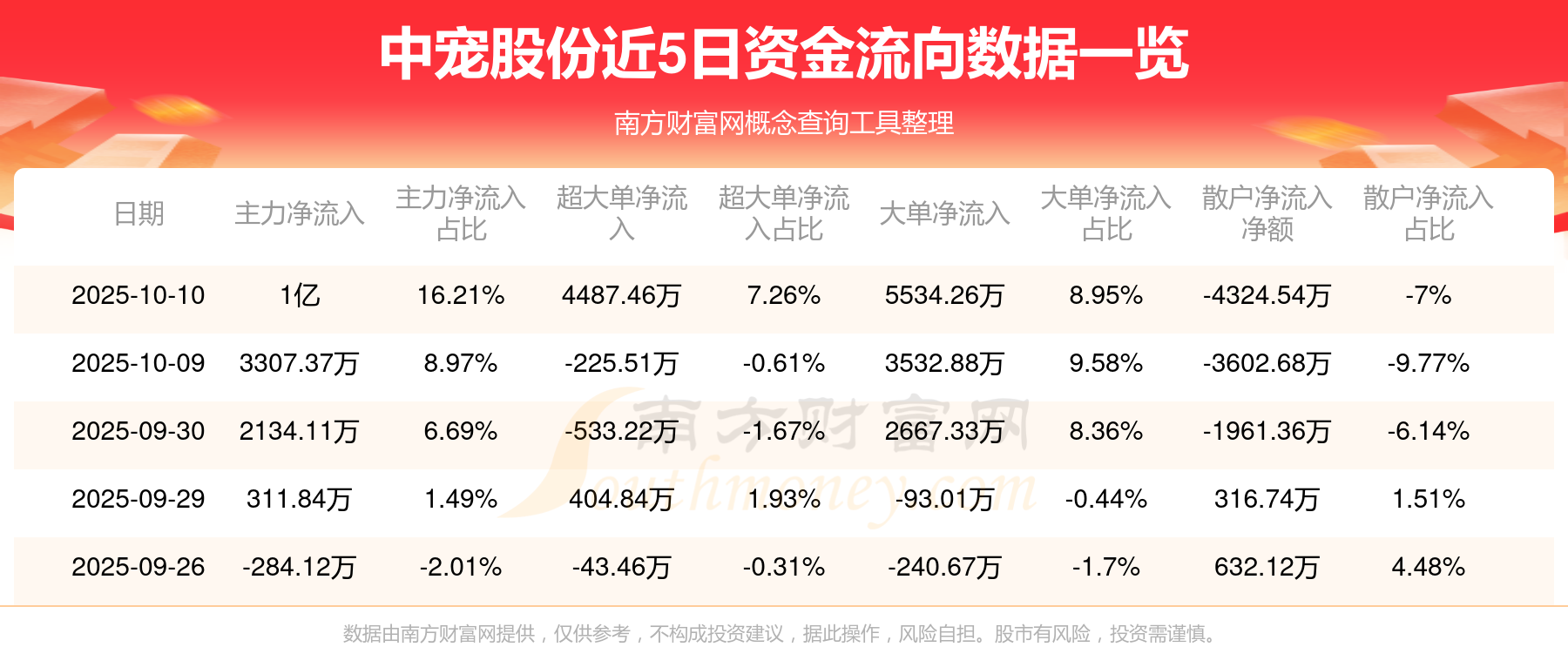 資金流向數(shù)據(jù)方面,10月10日主力資金凈流流入1億元,超大單資金凈流入4487.46萬元,大單資金凈流入5534.26萬元,散戶資金凈流出4324.54萬元。