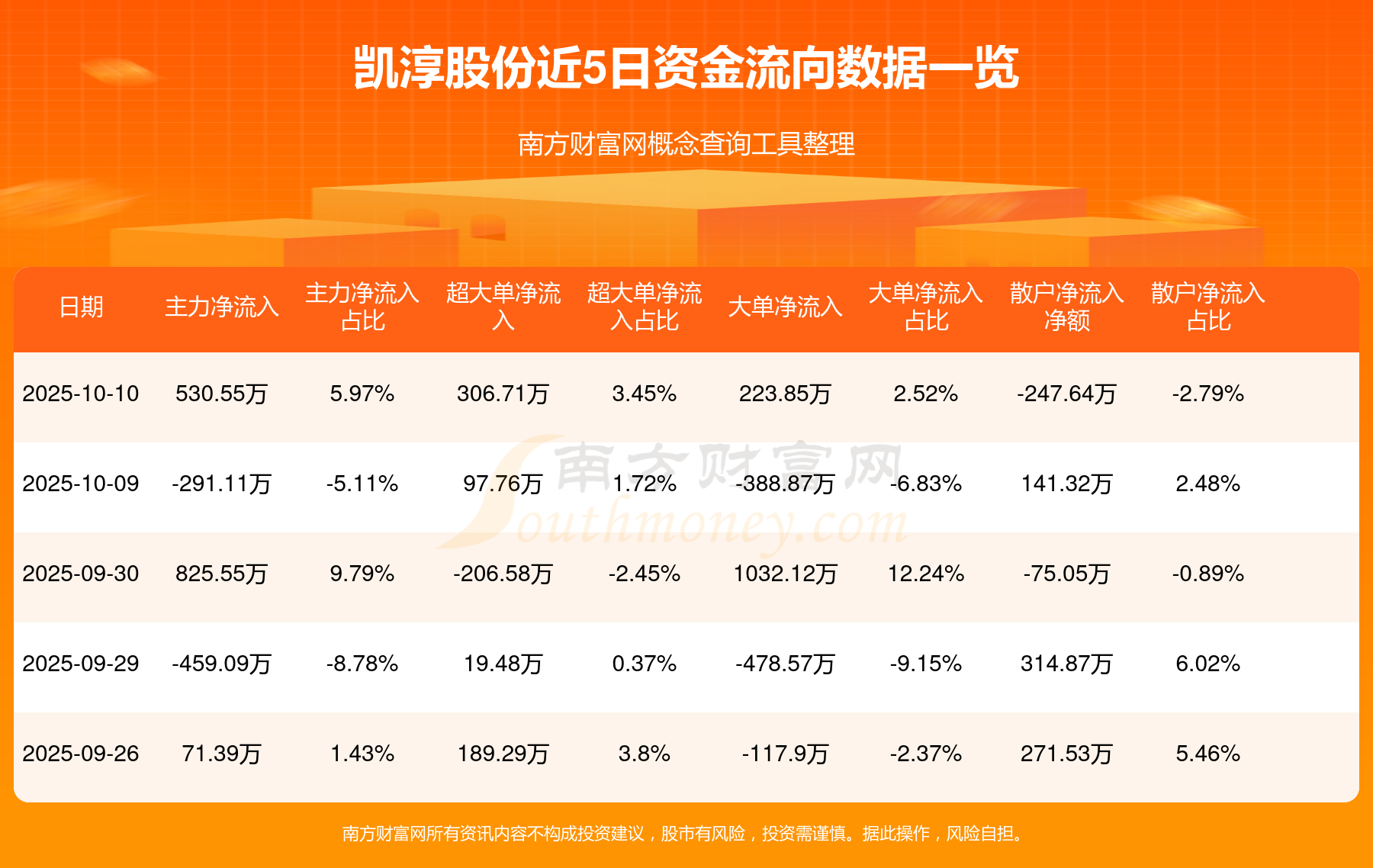 【10月9日】今日凱淳股份(301001)主力凈流入凈額530.55萬元,占比5.97%。該股開盤報31.59元,收于31.610元,跌0.89%,總市值為25.29億元,換手率5.6%。