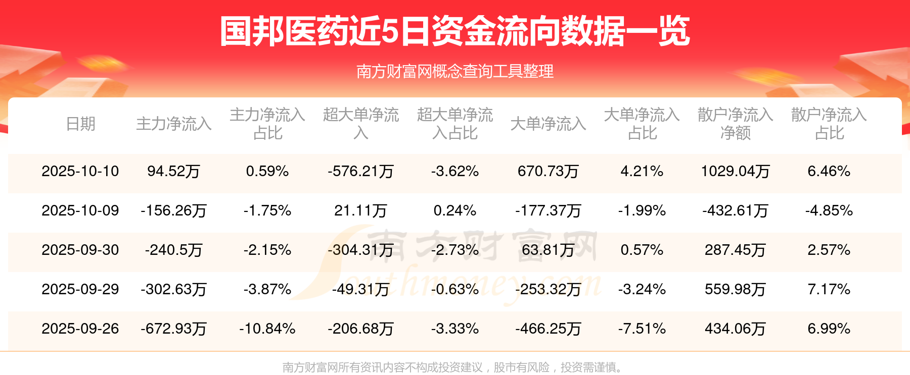 10月10日消息,國邦醫(yī)藥主力資金凈流入94.52萬元,超大單資金凈流出576.21萬元,散戶資金凈流入1029.04萬元。