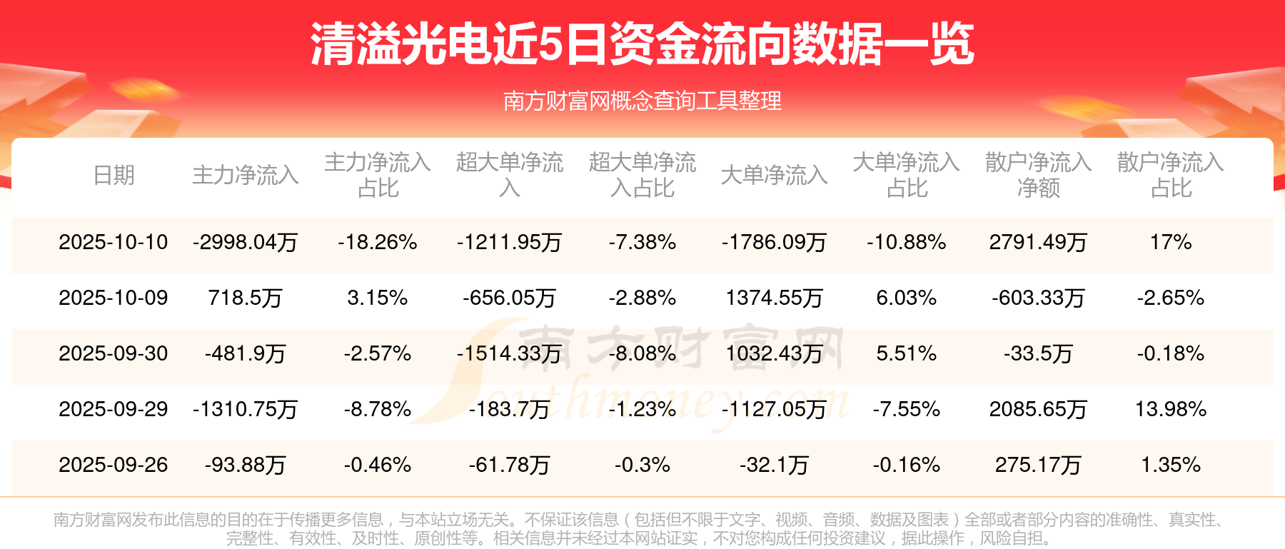 10月10日消息,清溢光電資金凈流出2998.04萬元,超大單凈流出1211.95萬元,換手率1.92%,成交金額1.64億元。