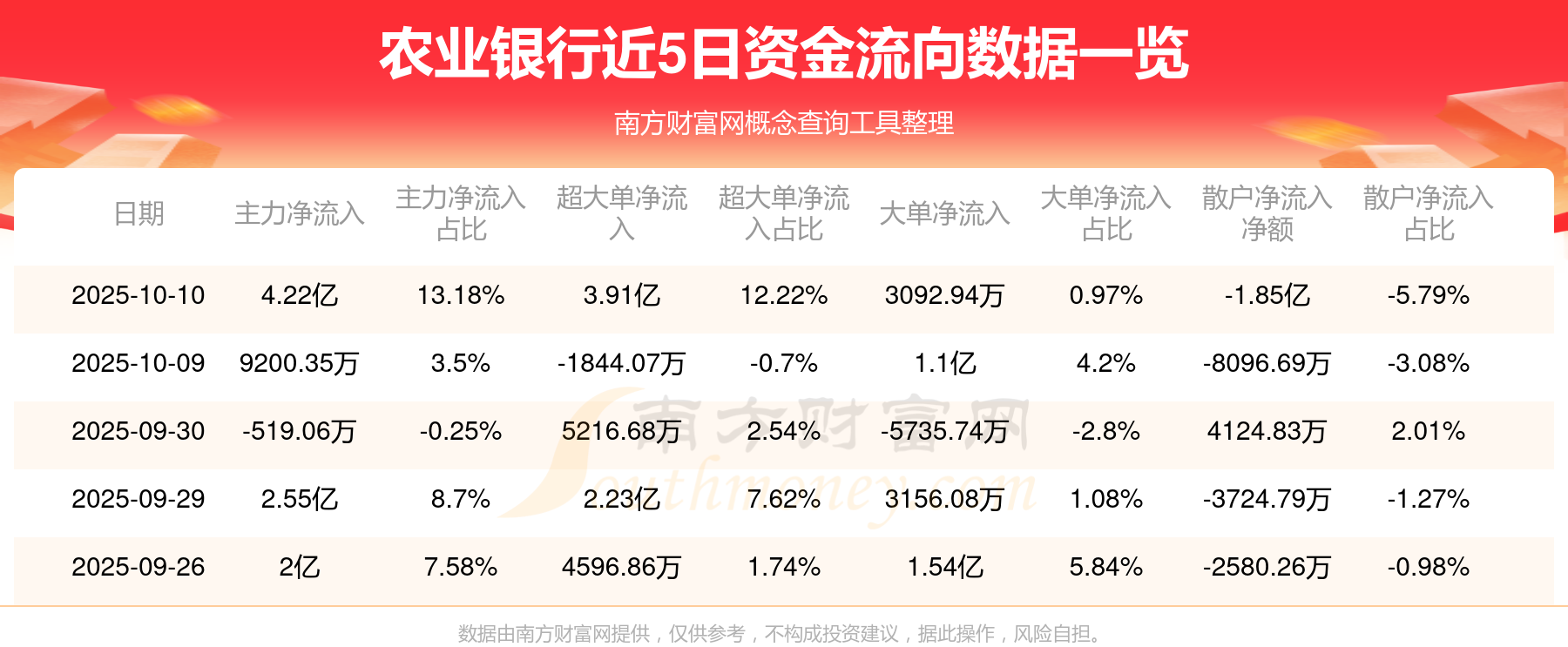 10月10日消息,農(nóng)業(yè)銀行10月10日主力資金凈流入4.22億元,超大單資金凈流入3.91億元,大單資金凈流入3092.94萬元,散戶資金凈流出1.85億元。