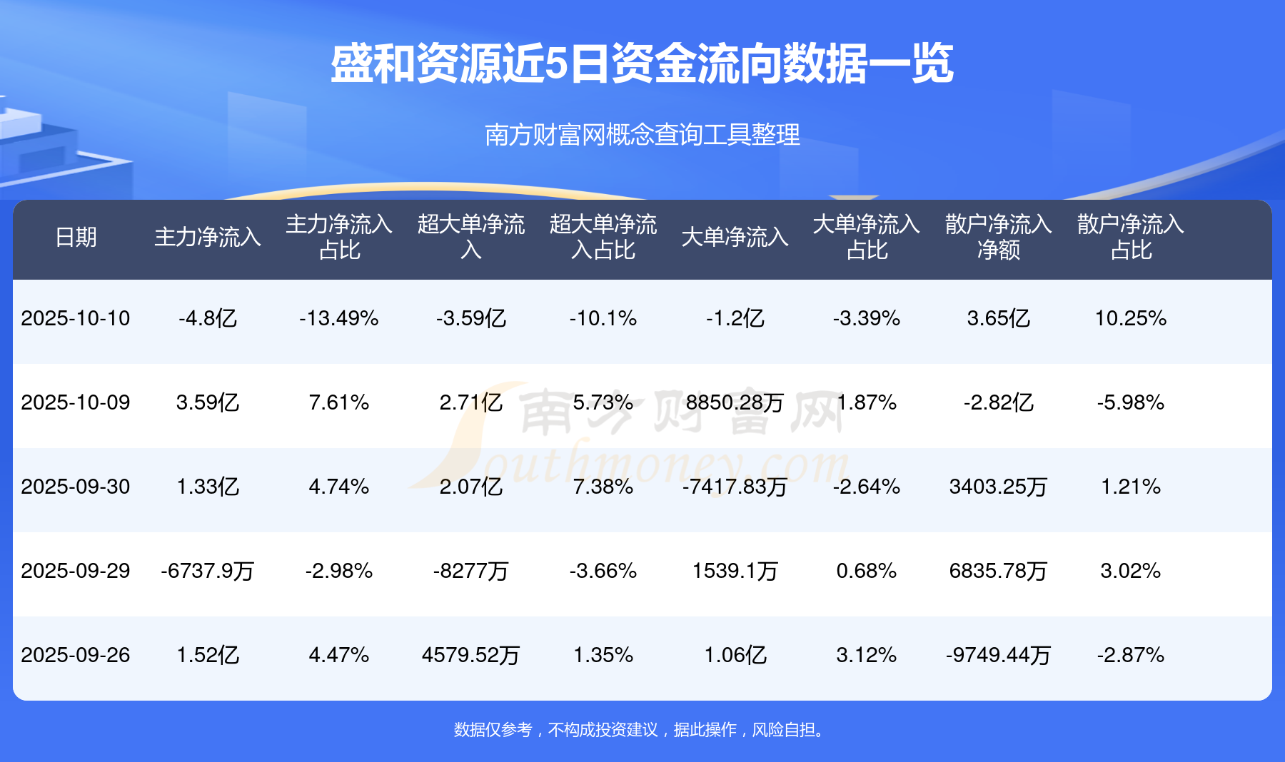 10月10日消息,盛和資源主力資金凈流出4.8億元,超大單資金凈流出3.59億元,散戶資金凈流入3.65億元。