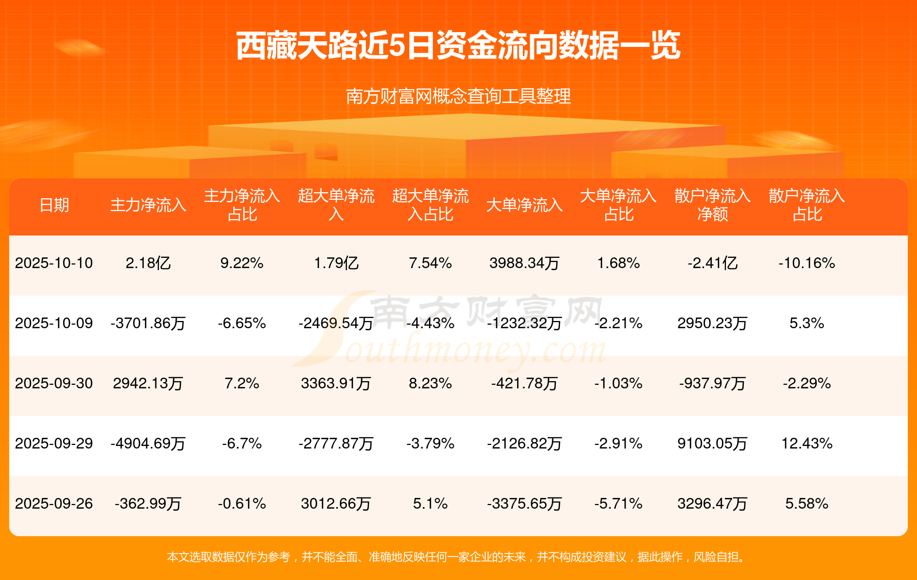 10月10日消息,西藏天路主力資金凈流入2.18億元,超大單資金凈流入1.79億元,散戶資金凈流出2.41億元。