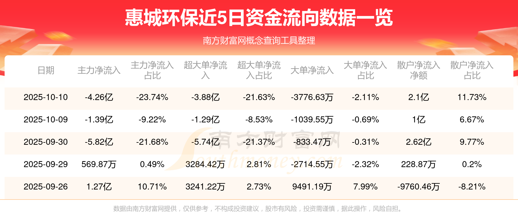10月10日消息,惠城環(huán)保主力資金凈流出4.26億元,超大單資金凈流出3.88億元,散戶資金凈流入2.1億元。